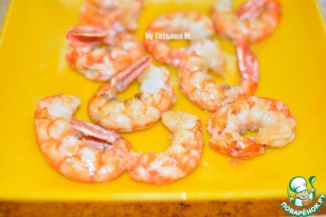Креветки почистить и обжарить с обоих сторон, чуть подсолив;