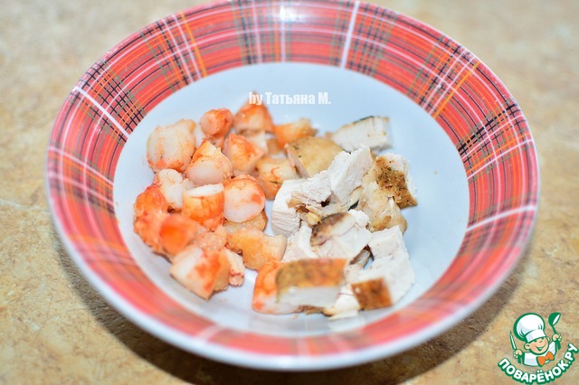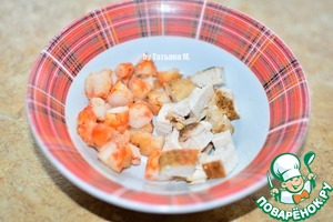 Креветки порезать кубиками (1 оставить для украшения), добавить резанную кубиками грудку;