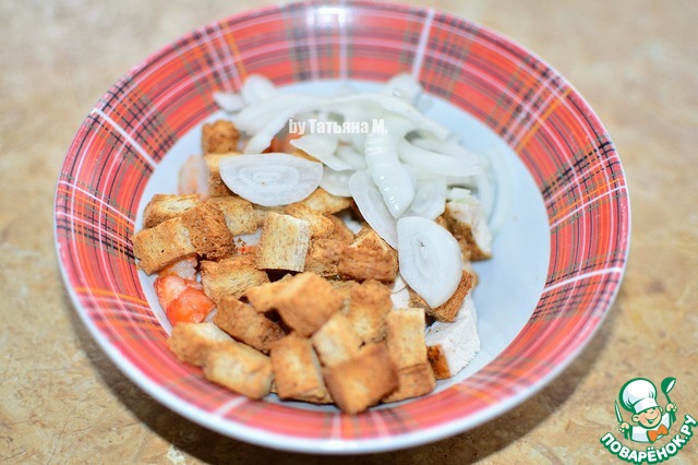 Добавить гренки (у меня домашние) и лук тонкими полукольцами;