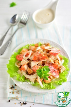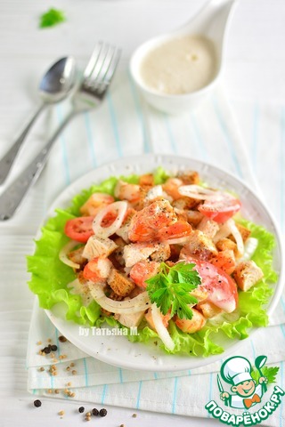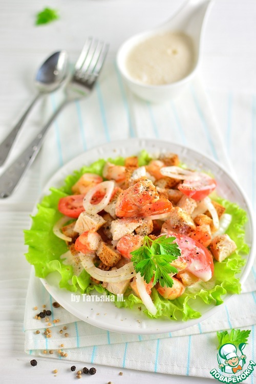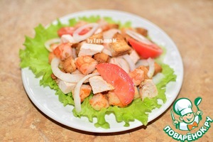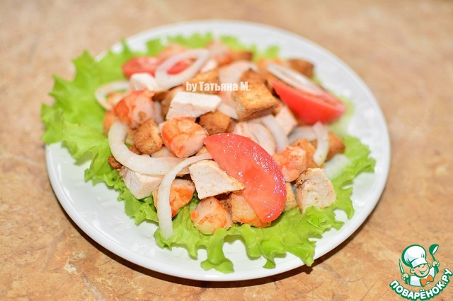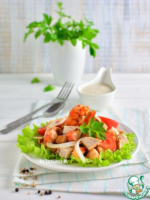 Очень вкусный и изысканный салатик с куриной грудкой Магги, жареными креветками, гренками под сметанной заправкой!