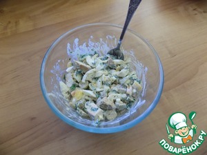 Всё выкладываем в салатник. Перчим, если нет детей в доме, заправляем майонезом. Поперчить можно и потом в тарелке. Солим, я не солила.