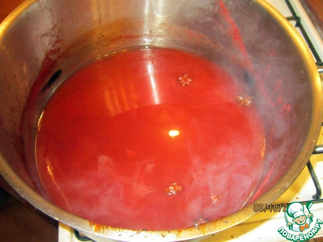 Получаем на выходе чистый арбузный сок, добавляем 4 коробочки бадьяна, кипятим ещё 5 минут на среднем огне.