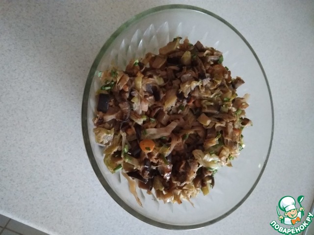 Добавить в сковороду к луку, моркови и баклажанам капусту. Перемешать.