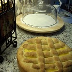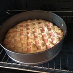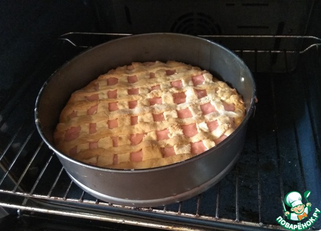 Вторую часть теста раскатать в пласт толщиной примерно 0,5 см и разрезать на полоски. Аккуратно выложить эти полоски на пирог.