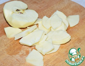 Крупное яблоко очистить, нарезать на тоненькие ломтики. Лучше брать яблоко кислых сортов или немного уменьшить количество сахара в начинке-креме.