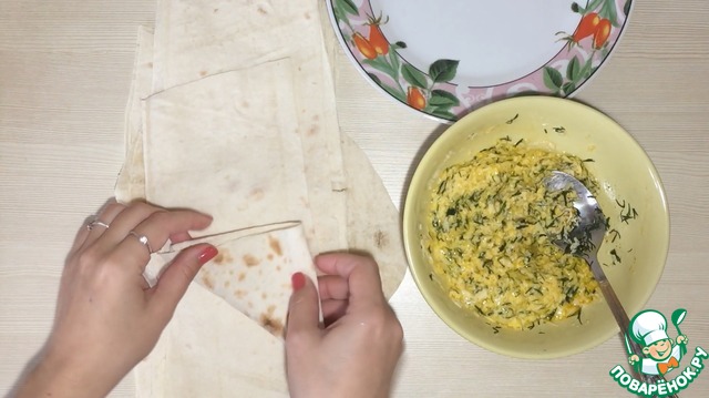 4. Разрезать лаваш на широкие полосы. Выложить начинку и скрутить к треугольнички.