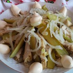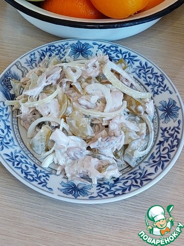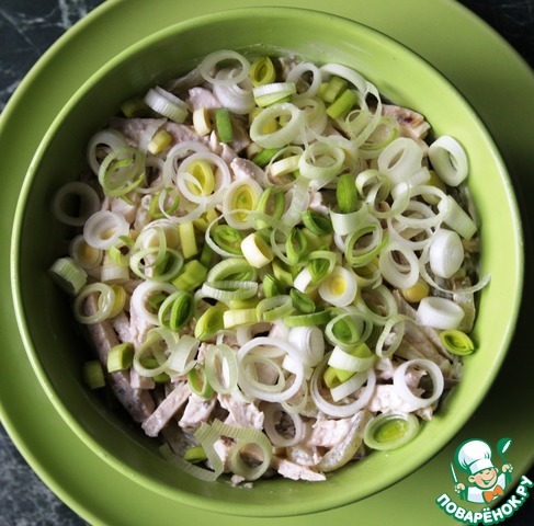 ... и много сочного, вкусного (не ядреного!) белого лука. Его нарезаем тонкими кольцами.