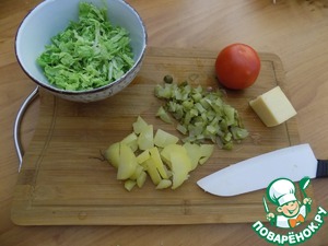 Пять шт листьев пекинской капусты отделила от кочана и вырезала прожилки. Скрутила рулончиком и тонко нарезала "лапшой" длинной. Картофель, огурцы и помидор порезала небольшим кубиком. Сыр натёрла на тёрке.