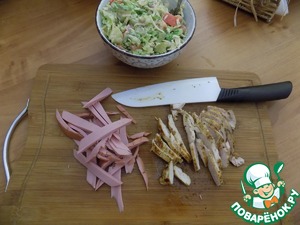 Нарезала ветчину и грудку длинными полосками и отправила в салат.