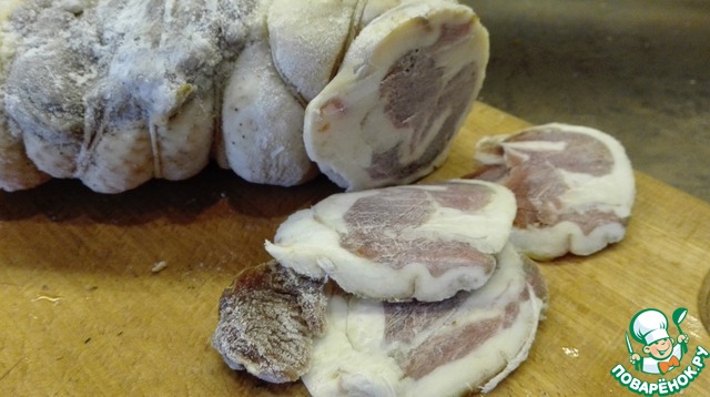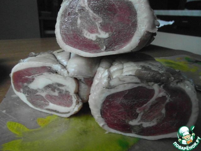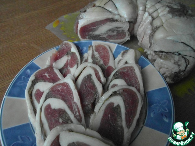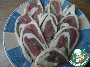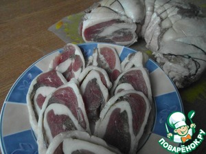 Хочу предложить простой рецепт. Те, кто любит соленое сало, будет очень интересно... Так как, в отличие от свиного соленого сала, здесь больше мяса, чем сала - надеюсь заинтересует и остальных хозяек... Скоро новогодние праздники. Этот рулет будет отличной закуской на стол, тем более его можно сделать заранее и держать в морозилке. Разрезать на несколько частей, что бы не размораживать весь рулет. В любой момент достаем кусочек нарезаем и подаем на стол. Хочу заметить, что это утка и размораживается очень быстро... да и нарезать желательно замороженным.