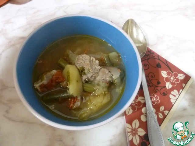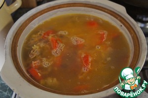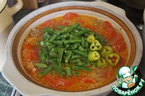 Открыть крышку и добавить в суп нарезанные стручки фасоли и ломтики горького перца.