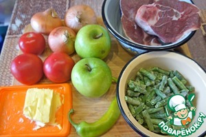 Пока варится бульон подготовить другие продукты. Репчатый лук, помидоры, стручки фасоли, стручковый перец и яблоки очистить. Лук и зелень петрушки мелко нашинковать. Помидоры нарезать кольцами. Стручковый перец разрезать на 6–8 ломтиков. Нарезать стручковую фасоль.