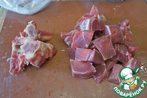 Мякоть баранины отделить от кости, промыть под водой, удалить пленки и сухожилия. Нарезать мякоть кубиками, примерно, как для плова.