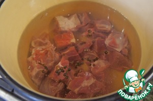 Кости и мякоть выложить в обычную кастрюлю, залить водой, добавить щепотку черного перца горошком, 3-4 горошины душистого перца, 2-3 гвоздички, слегка подсолить и поставить на сильный огонь. Довести до кипения, убавить огонь и варить до полной готовности, удаляя пену и лишний жир (1,5-2 часа). В конце приготовления бульона можно бросить парочку лавровых листьев, что удалит неприятный запах из бульона и придаст дополнительный аромат блюду. Когда мясо будет готово, вынуть его из бульона, а сам бульон процедить.