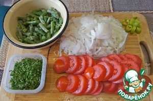 Подготовить продукты. К сожалению, у нас невозможно купить свежую стручковую фасоль, не пользуется она спросом у северян, поэтому её к нам и не возят. Очень-очень жаль. Пришлось использовать замороженную.