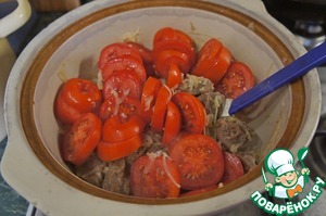 Отлить из кастрюли немного бульона. Оставшимся бульоном залить мясо с луком и помидорами, накрыть казан крышкой и проварить 5 минут.