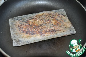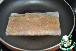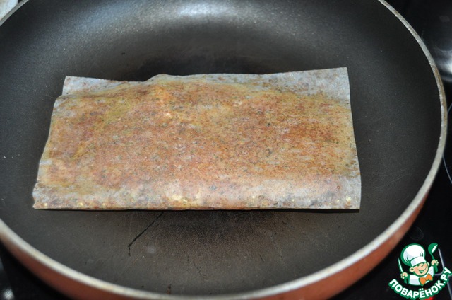 Кладём лист с филе на сухую нагретую сковороду. Готовим 7 минут на слабом огне.