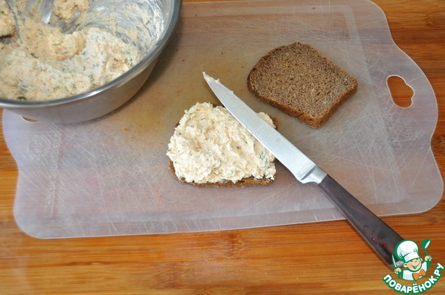 Намазываем рийет на хлеб. Не буду описывать как, чтобы меня не засмеяли. Закрываем вторым ломтиком хлеба, придавливаем.