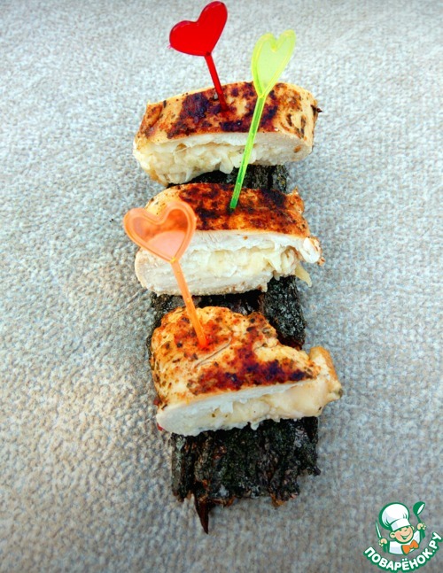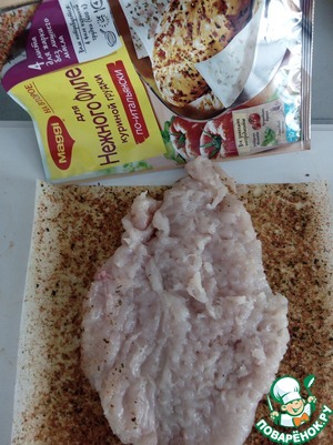 Куриное филе хорошо отбиваем, кдадем на лист для жарки от Магги.
