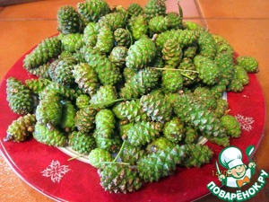 Он собирает именно зеленые молодые шишки. Засыпает их сахаром, через месяц шишки сами дают сок. Все.