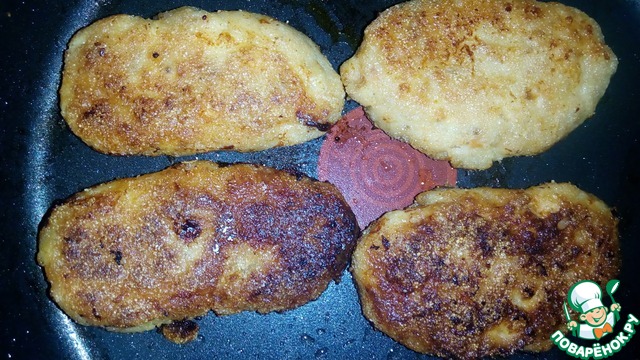 В сковороде разогреть растительное масло и положить котлеты. Обжарить с двух сторон до румяной корочки. За это время котлеты уплотнятся, и мы подливаем к ним немного воды. Закрываем крышкой, и доводим до готовности. Снимаем крышку и обжариваем до корочки, если любите.