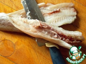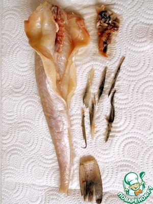 Первым делом нашу рыбу, если она мороженая, нужно разморозить. Для этого кладем ее в завязанном пакете на ночь в холодильник. Утром помыть и почистить от чешуи. Здесь есть тоже несколько секретов для разных видов рыб. Бывают рыбы, такие как угорь или налим, с телом покрытым слизью. И сколько бы Вы не старались ее смыть, рыбка все равно так и норовит ускакать из Ваших рук. Так вот, чтобы этого не было берем обычную соль и протираем ею тело рыбы. Слизь при этом счищается. Если у Вас рыба с крепко сидящей чешуей, и Вы ни как не можете ее отодрать, подойдет другой способ. Нужно размороженную рыбу положить в раковину и быстро облить ее очень горячей, но не кипятком, водой. Кожа при этом немного съежится и чешуя легко отойдет. После того как Вы почистили рыбу, приступаем к обработке. Для начала отстригаем все плавники и хвост, чтобы они не мешались и не кололись. Затем разрезаем брюшко и убираем внутренности и черную пленку. Пленку удобнее счищать со стороны хвоста и счищать ее нужно ОБЯЗАТЕЛЬНО, иначе она будет горчить. И снова моем. Даем стечь воде.