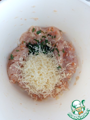 Сыр трем на мелкой терке, зелень петрушки мелко рубим. Совсем не много присаливаем (любители соленого).