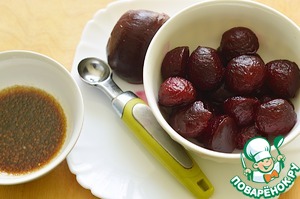 Пока курица жарится свеклу нарезать произвольно. (Свеклу я заранее помыла, завернула в фольгу и запекла в духовке примерно 30 минут при 180С. Время запекания зависит как от духовки, так и от величины свеклы.) Я с помощью ложки нуазетки вырезала шарики. Затем разрезала их на 2 половинки. Для заправки смешать все ингредиенты.