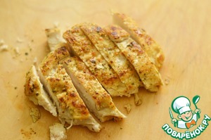 Готовую курицу нарезать произвольно. Листья салата вымыть, обсушить.