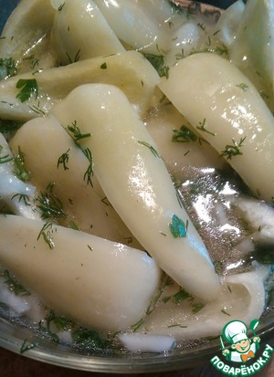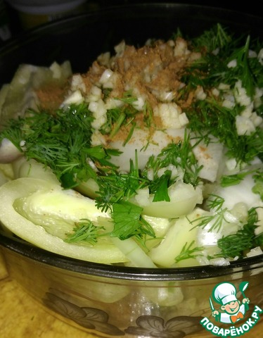 Времени и усилий нам понадобится минимум. Сначала у перца удаляем плодоножку и семена, разрезаем на 4 части. Лук очищаем, нарезаем крупными кольцами (у меня луковица большая, поэтому я резала полукольцами). Чеснок, зелень и острый перец мелко нарубить ( у меня перца не было, я заменила молотым красным жгучим, примерно 0,5ч. л здесь дело вкуса ). Подготовленные овощи и специи сложить в ёмкость для маринования (миску, кастрюлю) и перемешать.