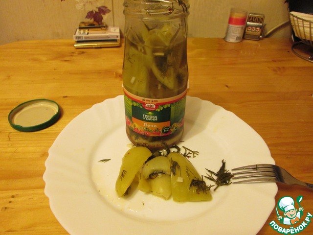Теперь ставим гнёт (я накрыла миску подходящей по диаметру тарелкой, а сверху поставила 0,5л баночку с водой), и оставляем на сутки мариноваться. На следующий день убираем в холодильник. Есть можно через сутки, я выдержала сразу 3 суток, и после этого угощала семью. У меня перец хранился в холодильнике 2 недели, пока не съели. Приятного аппетита