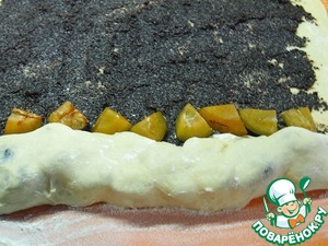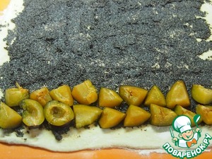 С помощью бумаги или коврика завернуть тесто. На границе разложить еще один слой слив, снова сделать один оборот и разложить третий слой слив. Завернуть рулет полностью, края прижать, чтобы сок не вытек.