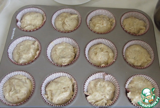 Выложить в формы для кексов или выпекать целым кексом, но тогда время выпечки увеличивается до 40 минут.