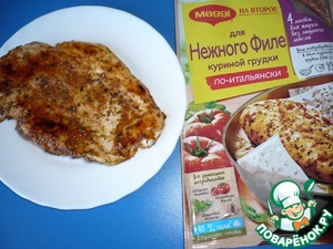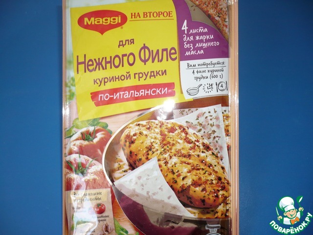 • Филе куриной грудки приготовить, согласно способа приготовления на упаковке MAGGI на второе для нежного филе куриной грудки по-итальянски.