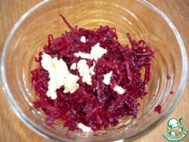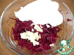 • Для приготовления соуса свеклу помыть, очистить от шкурки и натереть на мелкой терке. Выдавить через чесночницу зубчик чеснока.