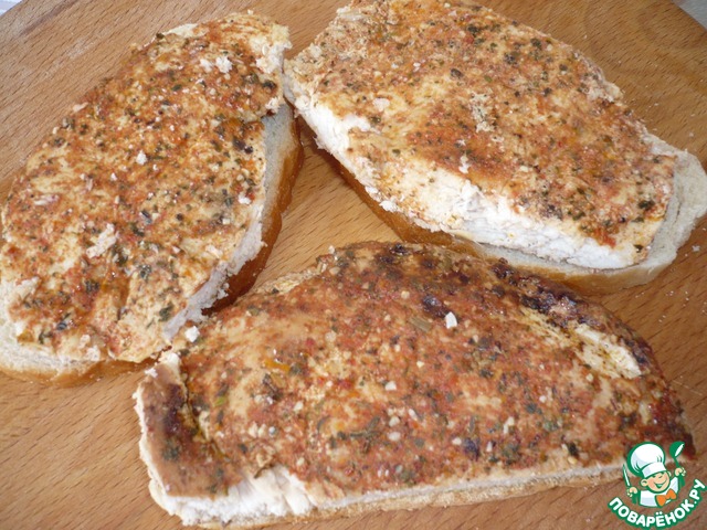 • На ломтик хлеба выкладываем куриное филе приготовленное с приправой MAGGI на второе для нежного филе куриной грудки.