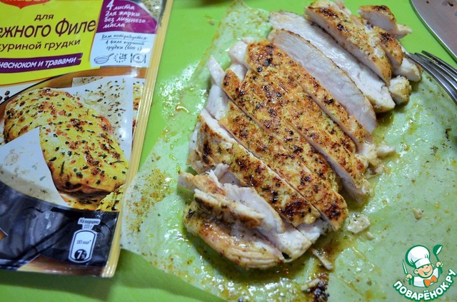 • Нарезать грудку на тонкие полоски.