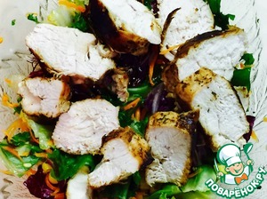 Наша курочка готова. Даем ей остыть и нарезаем ломтиками. Филе сочное, ароматное и пикантное, поэтому соль и специи для салата нам не понадобятся |