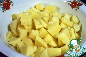 Говядину и свинину порезать не слишком мелко. Картофелины очистить, порезать крупным кубиком.