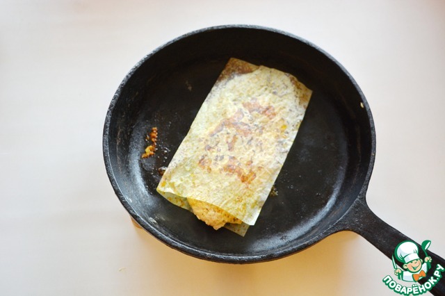 Раскалите сковородку без масла, поместите сюда филе, обёрнутое листом для жарки. Убавьте огонь до среднего.