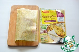 Упаковка содержит 4 листа По одному на каждое филе куриной грудки. Нам нужен один лист. Разверните его и положите на одну половину листа отбитое куриное филе