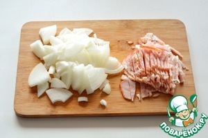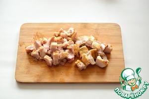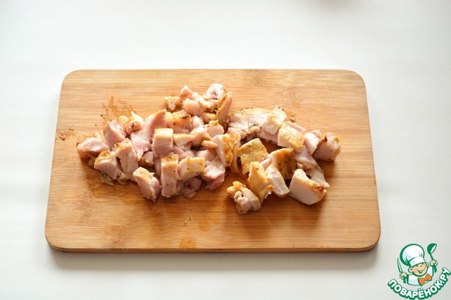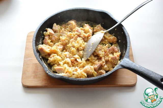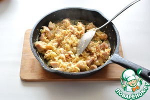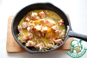 • Добавьте сюда нарезанное куриное филе и вбейте два яйца