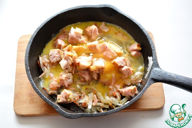 Добавьте сюда нарезанное куриное филе и вбейте два яйца