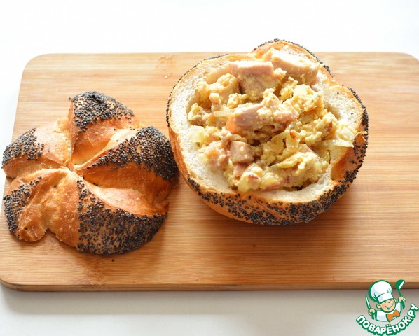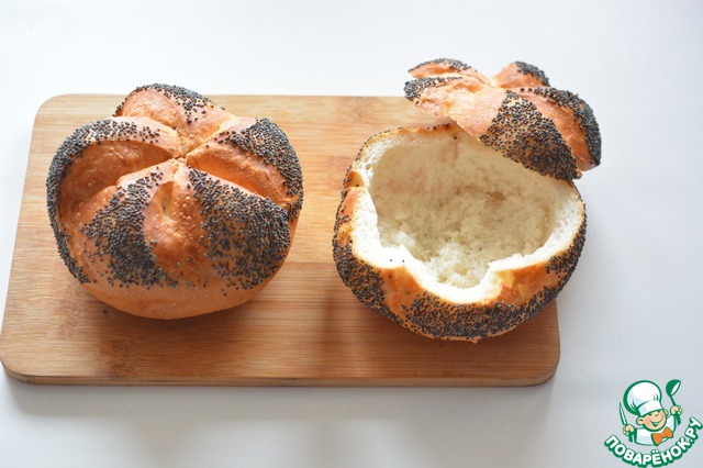 • Подходят для закуски любые не сладкие булочки. Срежьте у них верх, мякиш удалите, оставив стенки. Подогрейте булочки на сухой сковороде или в духовке