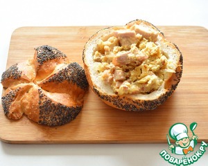 • В подогретые булочки положите начинку, накройте срезанной крышечкой
