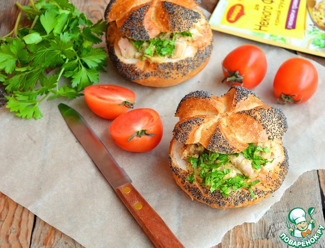 В подогретые булочки положите начинку, накройте срезанной крышечкой