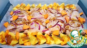 На противень, выстланный бумагой, укладываем куриные бедра - поливаем соусом, равномерно распределяя лук с чесноком, а также рядом произвольно выкладываем картофельные и морковные дольки - их можно посыпать паприкой и укропом. Далее все поливаем небольшим количеством оливкового масла, накрываем фольгой (я схитрила и поверх поставила еще один противень) и ставим в духовку. Выпекаться блюдо будет при температуре 230 градусов около 45 минут, после чего можно снять фольгу (убрать противень сверху) и дать подрумяниться еще 15 минут.