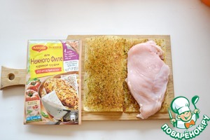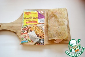 Филе куриное отбейте до толщины 1-2 см. Для приготовления будем использовать специальные листы для жарки куриного филе (МАГГИ на второе для нежного филе куриной грудки по-итальянски).