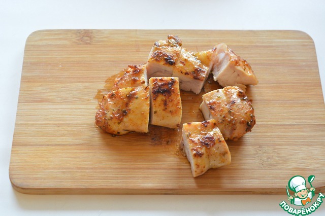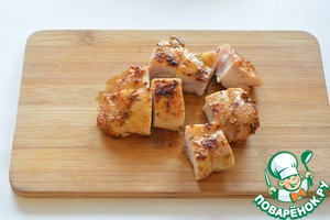 Остудите готовое филе и нарежьте его на кусочки, которые удобно будет нанизывать на шпажку