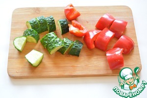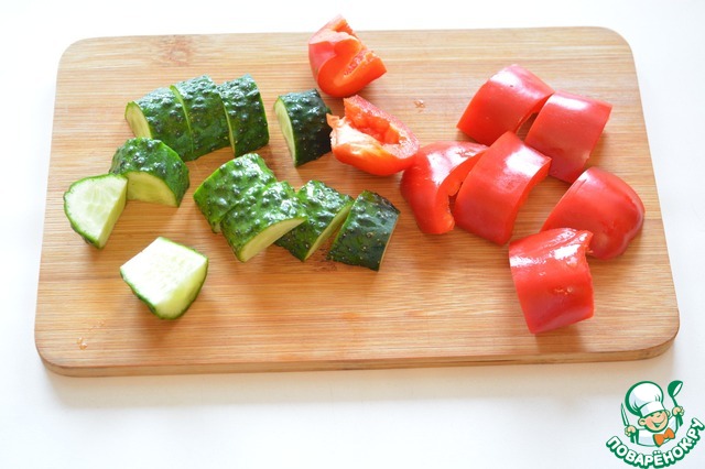 Такими же примерно кусочками нарежьте огурец и болгарский перец.